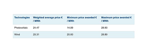 The lowest winning tariff under the auction was determined as €0.01489 per kWh for solar PV projects with the maximum for this technology going up to €0.0289 per kWh, while the weight average tariff was €0.02447 per kWh.