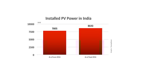Indian total installed PV capacity has crossed 8.6 GW. Clean energy consulting firm Mercom Capital Group reported that at the end of September 2016, India had an installed capacity of 8,643 MW.