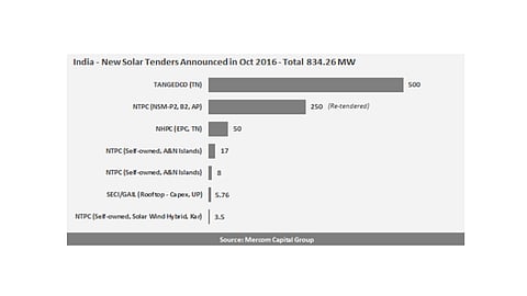 India has increased the pace of its solar activity having tendered 834 MW of PV capacity in October 2016. This is an increase of over 100% from September 2016 when 415 MW was tendered.