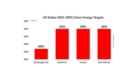 So far, Washington DC is the US state with the most aggressive 100% renewables target to be achieved by 2032; the other three – California, Hawaii and now New Mexico, are all aiming for 2045 (see Washington DC Confirms 100% RE Goal). However, California actually targets 60% RE by 2030, for 2045 it aims for 100% carbon-free power generation.
