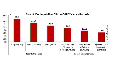 Germany's renowned PV research center, Fraunhofer Institute for Solar Energy (ISE) has attained a new world record, reaching a cell conversion efficiency of 21.9% for multicrystalline silicon (mc-Si) solar cells. The record lab-size cell, measuring 2 x 2 cm, features several developments and is a result of a 'cross-domain' improvement.