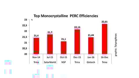 Leading Chinese PV module maker, Trina Solar once again raised the bar for best PERC cell performance on large size by announcing a new record efficiency of 22.61%. About year after publishing a 22.13% record in December 2015, the company has broken its own record with close to 0.5% absolute improvement, again based on PERC cell architecture. The new record cell has been developed by Trina's R&D wing, the so-called State Key Laboratory of PV Science and Technology of China (SKL PVST) on p-type Czochralski monocrystalline silicon substrate of 243.33 cm2 area. The results were independently certified by Germany's Fraunhofer ISE's CalLab.
