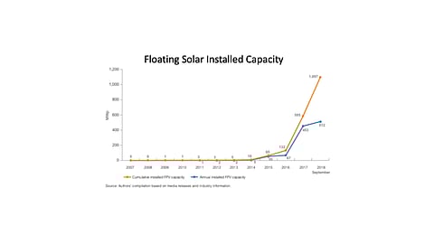 Having compiled media releases and industry information, the authors say in 2016, the world installed 67 MW of floating PV, which increased to 453 MW in 2017, and between January and September 2018, annual installations already reached 512 MW.
