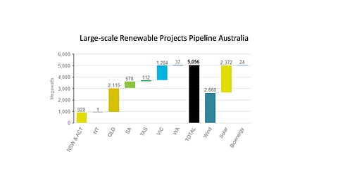 At the end of February, Australia had more than 5 GW of large-scale renewable projects under construction, according to Green Energy Markets' March 2018 edition of its Renewable Energy Index. Out of the 5,056 MW under construction, solar energy projects comprise 2,372 MW, while the wind capacity is even larger, reaching 2,660 MW. Another 24 MW of bioenergy projects make up the total. All of these projects are said to support 17,445 jobs