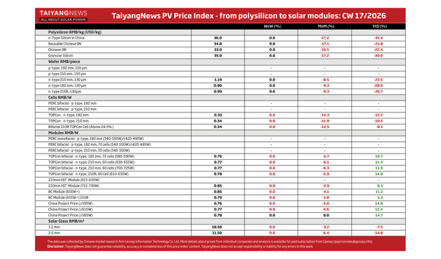Overall, the TaiyangNews PV Price Index remains firmly in the red in CY2026, with modules the only segment still in positive territory YtD. While prices were stable in CW17, polysilicon and wafers are down over 20% YtD, while solar glass and cells have recorded high-single- to low-double-digit declines.