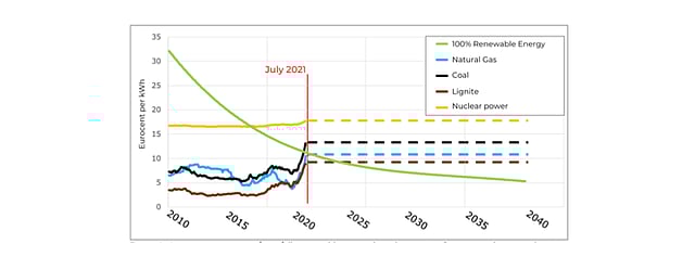 At the same time, costs of conventional power generation are increasing thanks to rising prices of natural gas, coal and carbon prices. In 2028, these conventional energy assets won't be able to cover their costs competitively. Even existing nuclear energy can stand on its own only till around 2040.