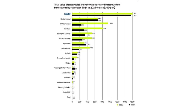 Global investment in renewable energy infrastructure rose 49% year-on-year (YoY) to about $496.7 billion in 2025, driven largely by rising electricity demand from artificial intelligence (AI) computing, according to a new report by Ansarada. Among renewables, solar PV leads with a clear majority, having witnessed 1,137 transactions worth $151.1 billion.