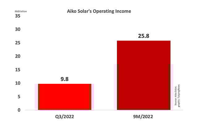 Solar cell manufacturer from China, Aiko Solar cites high selling price and technological improvements as reasons for its operating income in 9M/2022 growing 130.65% to RMB 25.8 billion, with Q3/2022 contributing RMB 9.8 billion to the total.