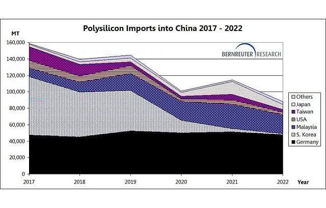 Polysilicon imports into China declined 23% annually to 88,093 metric tons (MT) in 2022 as the country ramped up new production capacities on its home turf, according to Bernreuter Research that forecasts further decline in imports into China which means the 'future of non-Chinese polysilicon feedstock lies outside' the Asian nation.