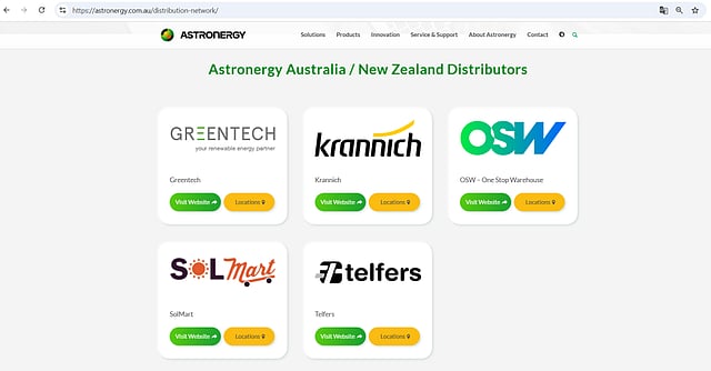 Distribution Network is a directory of distributors that is designed to enhance business-to-consumer (B2C) engagement and provide clarity for individual queries. It provides a few functional resources for users seeking commercial and technical details of Astronergy’s products. The platform allows users to filter listings by specific states and local territories within Australia and Oceania, helping localize the supply chain. Each entry provides the necessary contact details, including email addresses and phone numbers, facilitating direct commercial inquiries and logistical coordination. The platform also helps with technical support for the company’s products.