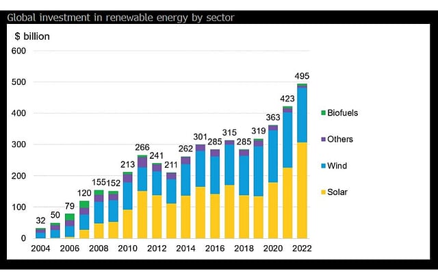 These details appear in BloombergNEF's Energy Transition Investment Trends report released in January 2023 in which it says this $495 billion was part of $1.1 trillion investment in global energy transition the world undertook in 2022 with solar PV manufacturing factories taking $23.9 billion of the total (see Solar Fabs Attracted $23.9 Billion Investment In 2022).