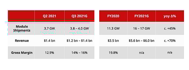 During Q3/2021, Canadian Solar expects to ship 3.8 GW to 4.0 GW solar modules with revenues ranging between $1.2 billion to $1.4 billion, and gross margin of 14% to 16%.