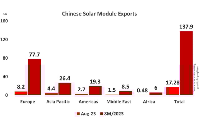 Among other markets, Asia Pacific took 4.4 GW of Chinese imports in August 2023—a 109% YoY growth—taking the cumulative in 8M/2023 to 26.4 GW.
