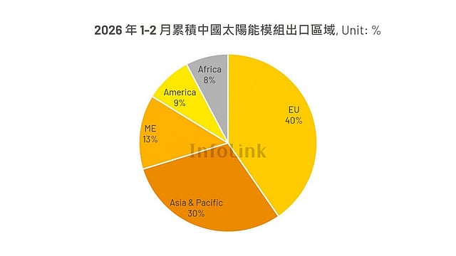 Of the total module shipments during 2M 2026 (17.35 GW in January and 17.71 GW in February), the domestic Chinese market was the largest buyer, accounting for about 40% (14.16 GW).
