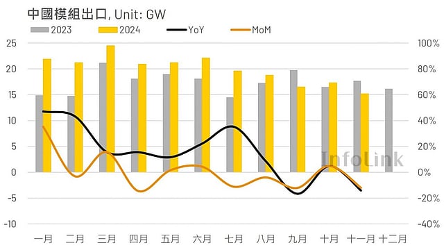 Chinese solar module exports in November 2024 totaled 15.2 GW, a 14% YoY decline