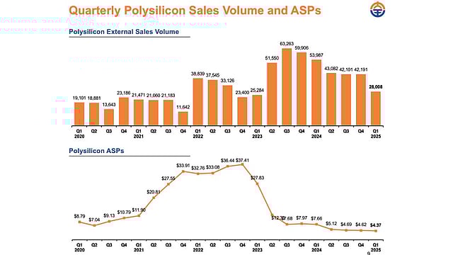 The manufacturer reduced its utilization rate to approximately 33% of its nameplate capacity in response to the challenging market conditions and weak selling prices. Together, its 2 factories produced 24,810 metric tons (MT) of polysilicon during the initial 3 months of 2025, thus not meeting up to 28,000 MT, the high-end of its guidance. Thanks to existing inventory, it managed to sell 28,008 MT, exceeding production. It did incur approximately $1.58/kg of idle facility related costs for the quarter.