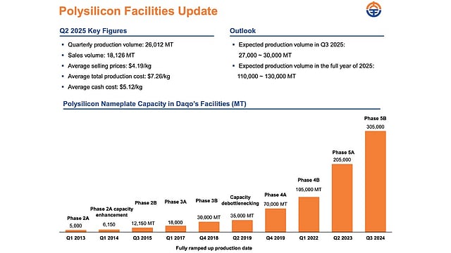 The average selling price (ASP) for polysilicon in Q2 2025 was $4.19/kg, down from $4.37/kg in the previous quarter (see Daqo New Energy Narrows Down Q1 2025 Net Loss To $71.8 Million).