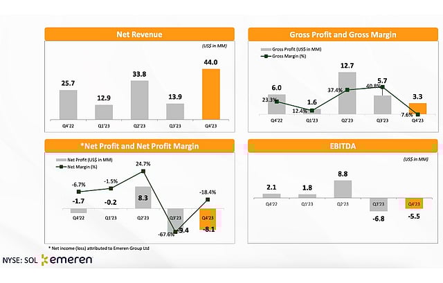 Listed on the New York Stock Exchange (NYSE) as SOL, Emeren's net loss during the year widened to -$9.3 million, a 100% increase over -$4.7 million in 2022.