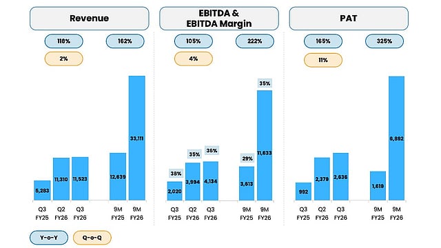 In terms of 9M FY26, its revenues improved by 162% to INR 33.1 billion, while EBITDA of INR 11.63 billion and PAT of INR 6.89 billion went up by 222% and 325% YoY, according to the manufacturer.