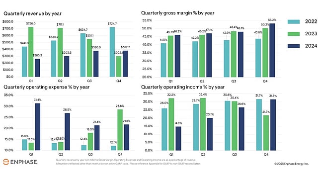 US-headquartered solar PV microinverter and battery systems supplier Enphase Energy reported positive GAAP operating income for yet another quarter in Q4 2024 with $54.8 million, compared to a negative $10.23 million in Q4 2023.
