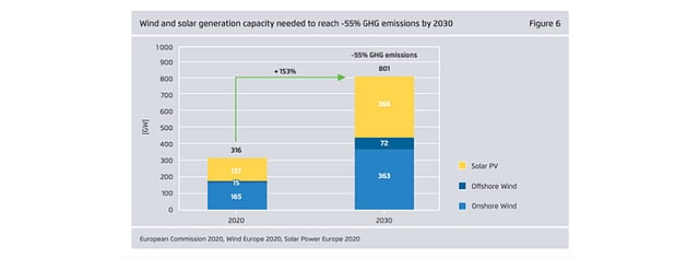 A strong demand for renewable hydrogen, as anticipated, will need to be supported by a strong growth of renewables At the end of 2020, European Union (EU) had an aggregate installed solar PV, offshore and onshore wind added up to 316 GW, it is required to grow by more than 150% and reach 801 GW by 2030, and reduce GHG emissions by 55% relative to 1990, with solar PV's share expected to grow from 137 GW in 2020 to 366 GW in 2030.
