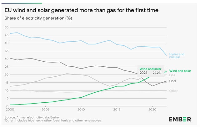 The year 2022 was a significant year for Europe when wind and solar power generated more than a 5th of European Union's (EU) electricity with 22% share, overtaking 20% generated by expensive fossil gas and 16% coal power for the 1st time ever, but it was solar that 'really shined' as it shielded Europe from the energy crisis, says Ember in a new report.