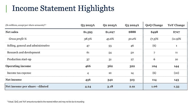 US solar PV module manufacturer First Solar has reported an increase of $0.5 billion in its net sales totaling $1.6 billion for Q3 2025, attributing it to the increase in the volume of solar modules sold during the quarter at 5.2 GW. It was also over $700 million more than $888 million the company reported for Q3 2024 (see QoQ Drop In Sales For First Solar In Q3 2024; Lowers Annual Guidance).