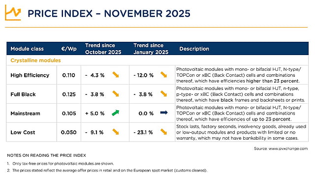 As per pvXchange, as of November 12, 2025, there was a 4.3% decline in high-efficiency (above 23%) solar module prices since October 2025, and a larger 12% drop since January this year, sitting at €0.110/W compared to €0.115/W as of October 12, 2025 (see Solar Module Prices React To Changing Demand, Says pvXchange).