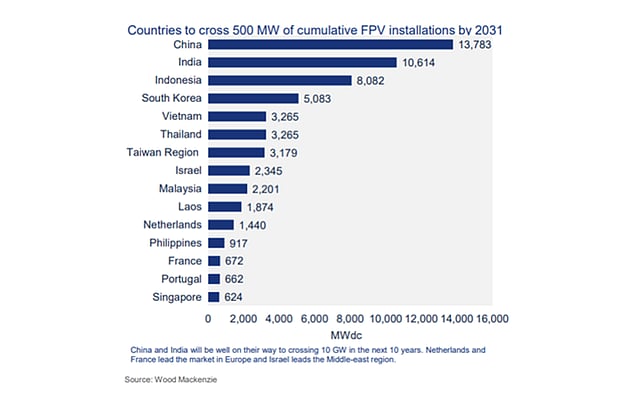 By 2031, 15 countries are likely to exceed 500 MW of cumulative FPV installations with China, India and Indonesia accounting for almost 70% of total FPV demand in 2022.