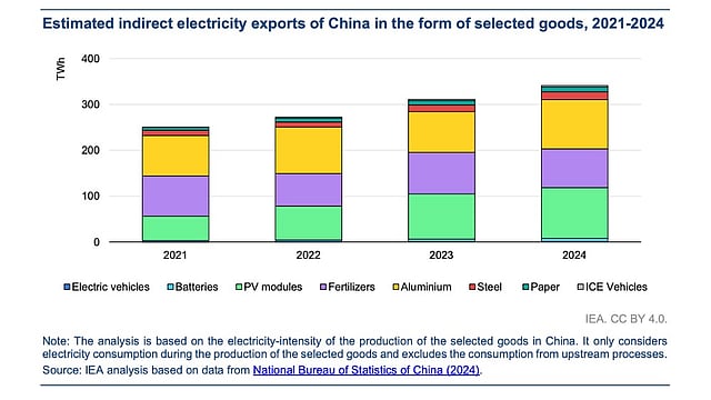 Emerging and developing economies will account for 85% of this demand growth over the next 3 years, led by China where electricity consumption rose by 7% in 2024, and is expected to grow by an average of around 6% by the forecast year. Electricity-intensive manufacturing of solar panels, batteries, electric vehicles (EV) and associated materials are contributing to China’s growing demand for electricity. To understand this, the report writers analyze the country’s exports of energy-intensive goods in the form of products manufactured in the country.