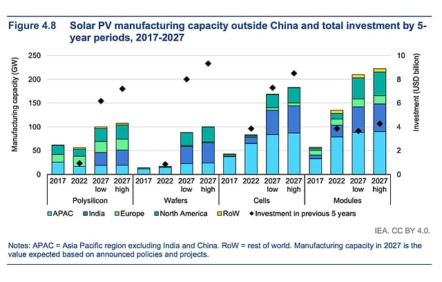 "The report sees emerging signs of diversification in global PV supply chains, with new policies in the United States and India expected to boost investment in solar manufacturing by as much as $25 billion over the 2022-2027 period. While China remains the dominant player, its share in global manufacturing capacity could decrease from 90% today to 75% by 2027," states the IEA.