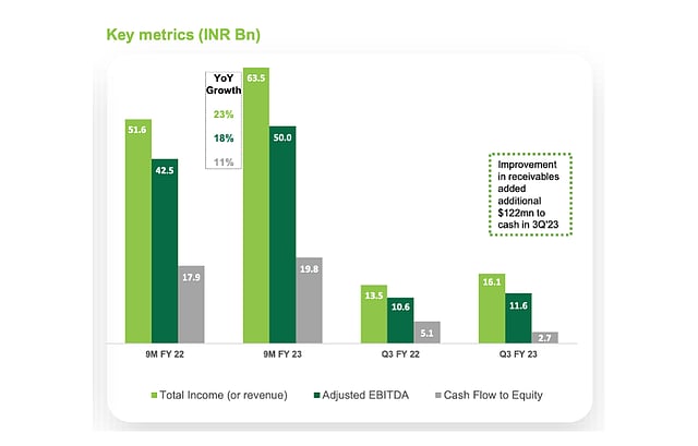 For FY23 (period ending March 2023), ReNew has expects its adjusted EBITDA to range between INR 61,000 million to INR 63,000 million and cash flow to equity between INR 15,000 million to INR 17,000 million. Management says both these forecasts are subject to normal weather for the rest of the year.
