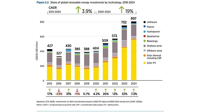 While there was a 7.3% annual increase in renewable energy investments last year, the pace of growth slowed compared to the 32% growth recorded in 2023 when investments hit $752 billion, according to IRENA.