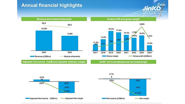 JinkoSolar shipped over 86 GW of solar modules in FY2025, which it says helped it retain its top global ranking for the 7th time, but with a 7.3% annual decline from 92.9 GW in 2024 (previously reported as 99.59 GW). Close to 60% of the module shipments were to overseas markets, with US shipments accounting for approximately 5% in 2025.