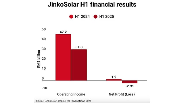 JinkoSolar’s principal operating subsidiary, Jiangxi Jinko, has reported a decline of 32.6% YoY in its operating income of RMB 31.8 billion ($4.4 billion) for H1 2025. It also suffered a net loss of RMB 2.91 billion ($406 million) – an annual decline of 342.38% compared to a net profit of RMB 1.20 billion in H1 2024.
