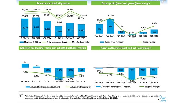 JinkoSolar’s revenues climbed almost 30% quarter-on-quarter (QoQ) in Q2 2025 with RMB 17.99 billion, but fell sharply (25.2%) from a year earlier, as weaker module prices dragged down overall performance. The company’s revenues then slipped again in Q3 to RMB 16.16 billion (10.2% QoQ and 34.1% YoY) as both shipments and selling prices declined.