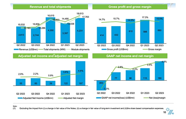 According to the management, "We are optimistic that the stabilization of prices along the supply chain will stimulate pent-up demand gradually. We raise our module shipment guidance for 2023 to be in the range of 70 to 75 GW."
