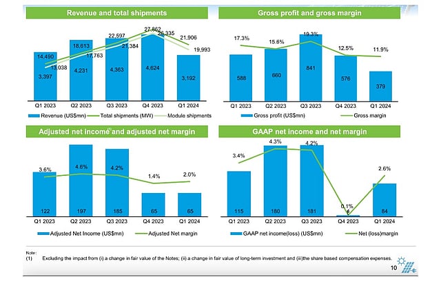 JinkoSolar's gross profit of $378.8 million also dropped 33.1% quarter-on-quarter (QoQ) and 32.2% YoY, while gross margin declined to 11.9%, compared to 12.5% in Q4/2023 and 17.3% in Q1/2023. Its net income of $84.4 million was up 19.8 times sequentially.