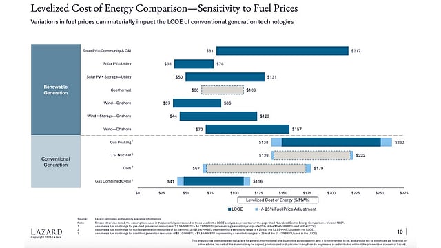 Unsubsidized utility-scale solar and onshore wind continue to remain the lowest-cost new-build power sources in the US for the 10th year in a row