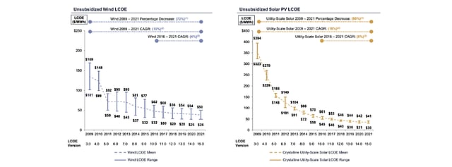 In its annual publication Levelized Cost of Energy Analysis (LCOE) 15.0, Lazard said it is seeing rates of decline in the LCOE for onshore wind and utility scale solar to have slowed down in recent years, yet continued to decline thanks to reductions in capital costs, increased competition and continued improvements in scale and technology… an observation it shared in the LCOE 14.0 (see Lazard Releases Levelized Cost Of Energy Analysis 14.0).