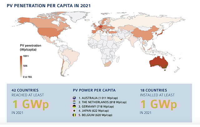A total of 42 nations reached at least 1 GW capacity in 2021 while 18 nations installed at least 1 GW last year. In terms of PV penetration per capita, Australia stands on top with 1011W per capita, followed by the Netherlands with 818 W per capita and Germany with 718 W per capita.