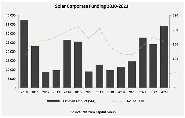 Mercom Capital Group counts total corporate funding in solar sector in 2023 to have grown by 42% YoY, making it the year when the largest amount was raised in over a decade. Despite high interest rates and challenging market conditions, it says the industry raised $34.3 billion last year.