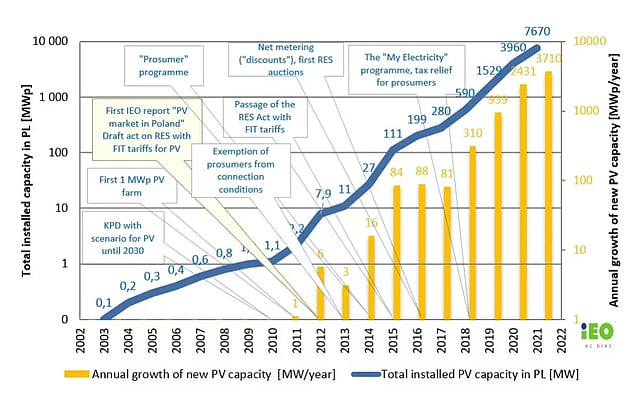 In its latest report Photovoltaic Market in Poland 2022, the IEO says the country exited 2021 with the annual addition of 3.7 GW, compared to 2.43 GW in 2020 thanks to high electricity prices and regulatory changes. In May 2022, it crossed 10 GW cumulative capacity.