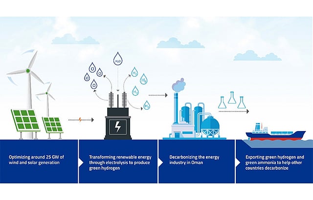 This project plans to install some 1,800 wind turbines and 20 million solar panels on 6,500 sq. km. area, over a period of about 10 years with production, storage and supply of green hydrogen taking place in the distribution area of the Special Economic Zone south of Duqm. Final investment decision is scheduled in 2026.