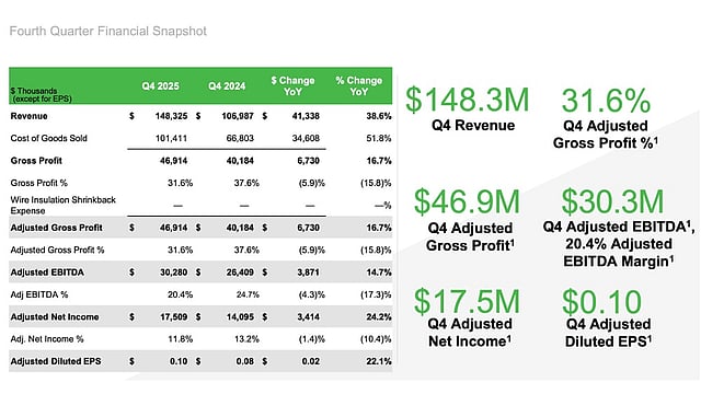 Shoals also reported a 39% revenue increase in Q4 2025, to $148.3 million from $107 million in Q4 2024, for the same reason, and within its guided range. Q4 gross profit of $46.9 million improved over $40.2 million.
