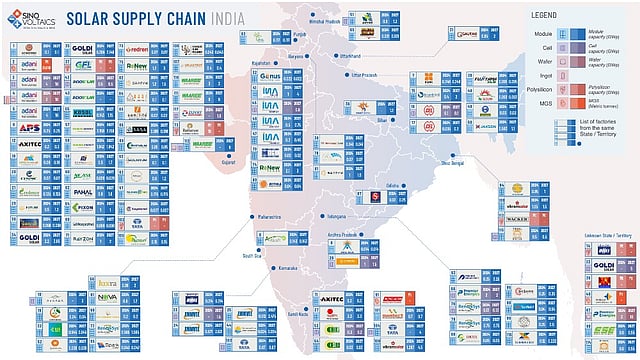 New companies and the growth of existing ones are helping India become an important part of the global solar panel industry, according to Sinovoltaics’ updated India Solar Supply Chain Map 2025. It lists key names including Reliance Industries in Gujarat, Evervolt’s base in Andhra Pradesh, Zuvay Technologies in Gujarat, Avaada in Maharashtra, Group Surya in Bihar, and Luxra in Maharashtra.