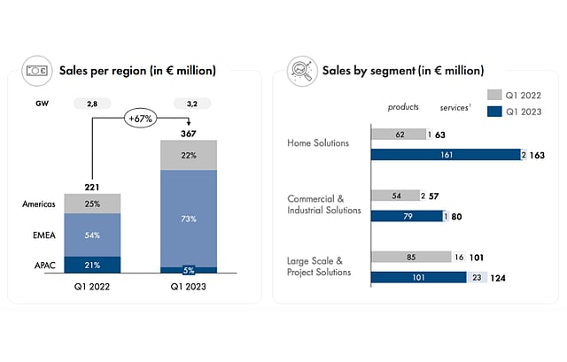 Consistent high demand and electronic components supply chain improvement were major reasons for SMA Solar Technology's 66.5% annual and 7.3% quarterly increase in Q1/2023 sales of €367.2 million, led by Europe Middle East and Africa (EMEA) region accounting for 73% share.