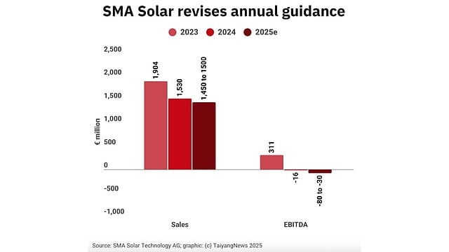SMA forecasts its annual sales to range from €1.45 billion to €1.5 billion, and EBITDA between -€80 million and -€30 million. These compare to the company’s previous guidance for sales of €1.5 billion to €1.55 billion and EBITDA of €70 million to €80 million (see SMA Solar’s H1 2025 Sales Impacted By Home & Business Segment).
