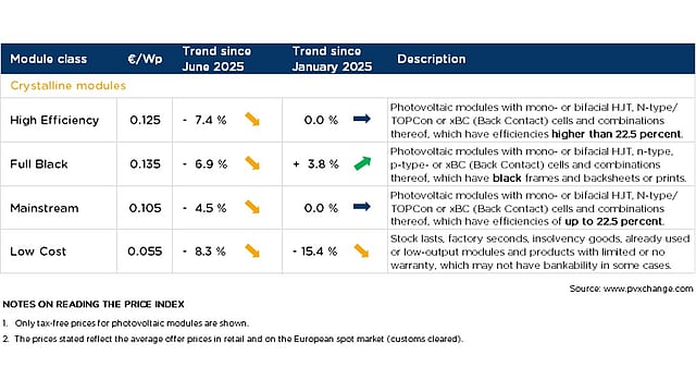 As of July 9, 2025, prices for crystalline silicon solar PV modules with an efficiency of over 22.5% dropped by 7.4% since June 2025 to €0.125/W. Over the same period, there was a decline of 4.5% for full-black modules, while mainstream panels with up to 22.5% efficiency saw their prices drop by 4.5% to €0.105/W.