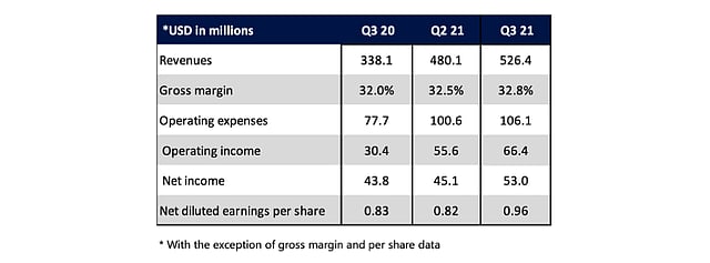 Of the Q3/2021 revenues, GAAP gross margin was 32.8%, up from 32.5% in the previous quarter and 32% in Q3/2020. Solar segment's gross margin of 36.6% was slightly down from 37.4% from the last quarter but up from 34.8% from last year (see A Healthy Q3/2020 For SolarEdge Technologies).
